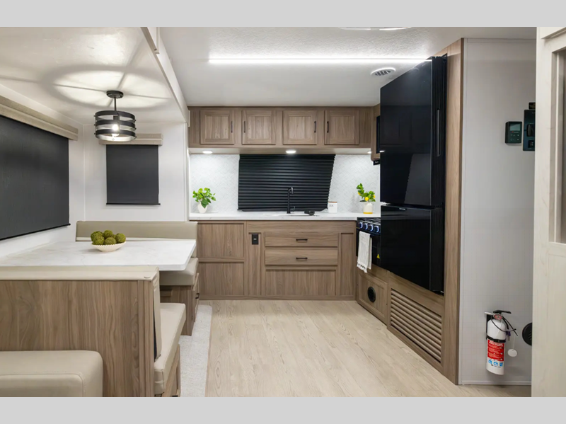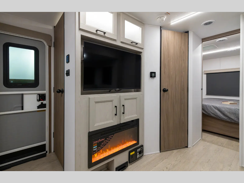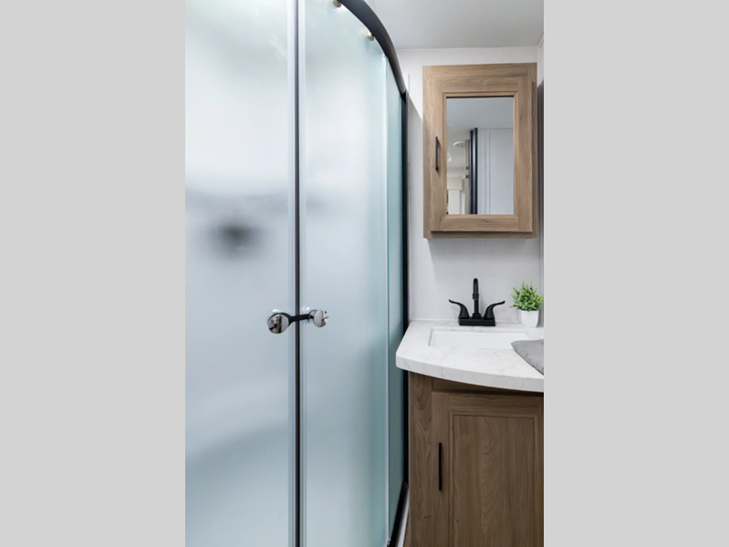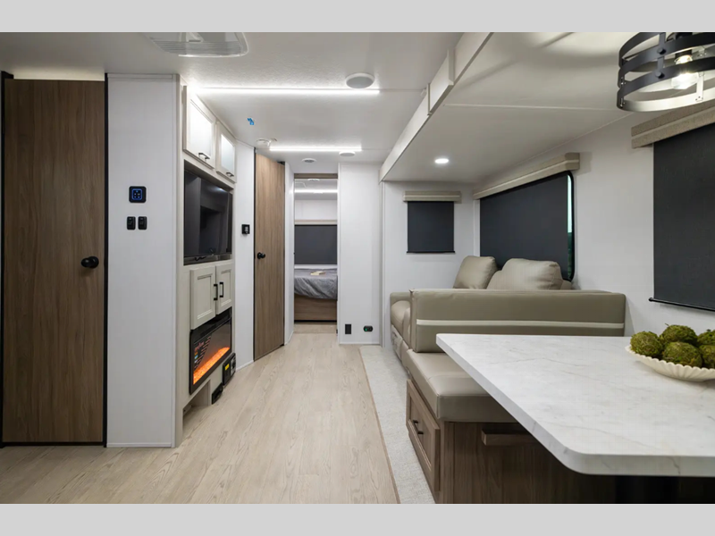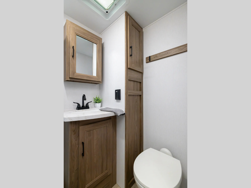 Each model is constructed with vacuum bonded walls with durable Azdel Composite, Dicor Tufflex PVC roofing, and a 3/4 gel coated fiberglass cap with an automotive glass windshield. The 81" interior height will provide more standing room, and the wear-resistant vinyl flooring is ultra durable. Head outside to find a power awning with an LED light strip, a pet leash/bottle opener, a power tongue jack, plus many more convenient amenities.