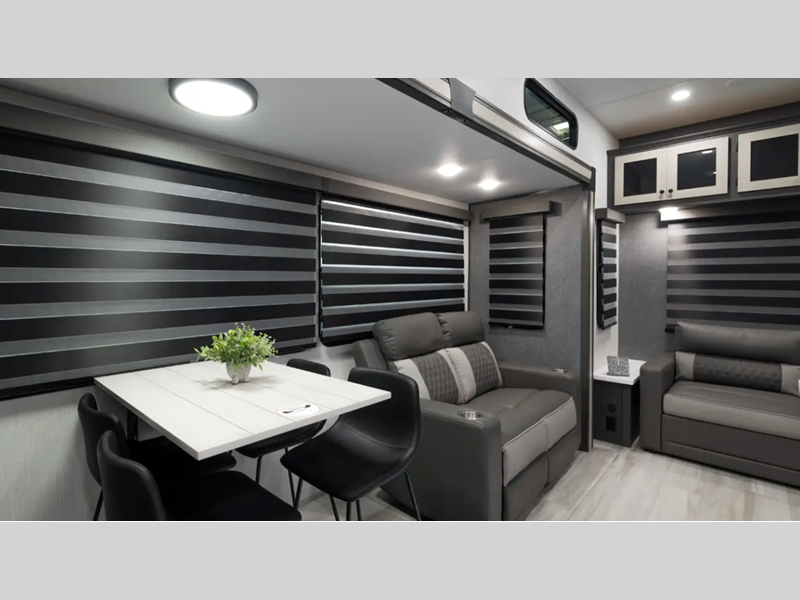 Sleeps 5 Slides 4 Length 43 ft 3 in Ext Width 8 ft Ext Height 13 ft 6 in Hitch Weight 2150 lbs GVWR 14908 lbs Dry Weight 12208 lbs Cargo Capacity 2700 lbs Fresh Water Capacity 60 gals Grey Water Capacity 114 gals Black Water Capacity 76 gals Furnace BTU 35000 btu Number Of Bunks 3 Available Beds King Refrigerator Type 12V Refrigerator Size 16 cu ft Number of Awnings 1 LP Tank Capacity 20 lbs Water Heater Type On Demand Tankless AC BTU 18000 btu TV Info LR LED TV Awning Info 19' Power Axle Count 2 Washer/Dryer Available Yes Number of LP Tanks 2 Shower Type Standard Electrical Service 50 amp Similar Floorplans
