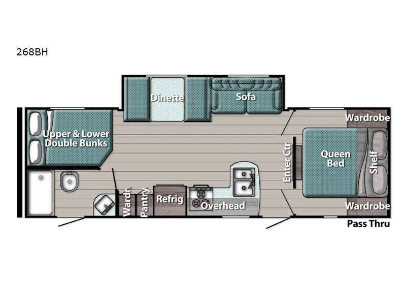 Sleeps 7 Length 26 ft 7 in Ext Width 8 ft Ext Height 10 ft 4 in Int Height 6 ft 8 in Hitch Weight 500 lbs Dry Weight 3899 lbs Cargo Capacity 3601 lbs Fresh Water Capacity 23 gals Grey Water Capacity 36 gals Black Water Capacity 36 gals Tire Size 14" Furnace BTU 20000 btu Number Of Bunks 2 Available Beds Queen LP Tank Capacity 20 lbs Water Heater Type Tankless AC BTU 13500 btu Axle Count 2 Number of LP Tanks 2 Shower Type Tub/Shower Combo Electrical Service 30 amp Similar Floorplans